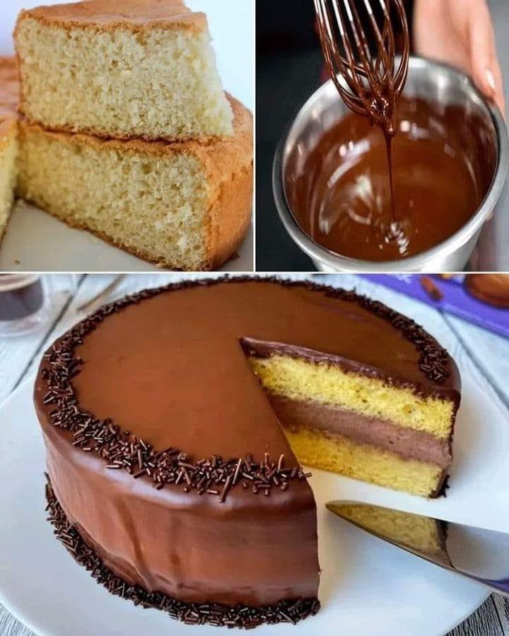 3. Na talerzu połóż ciasto. Na wierzch ciasta wylej połowę śmietany, a na śmietanę połowę polewy czekoladowej, przykryj wszystko drugim biszkoptem, wylej pozostałą śmietanę na wierzch i na koniec przykryj ciasto drugą połową polewy czekoladowej.