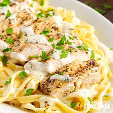 Add cooked pasta to the Alfredo sauce, tossing to coat. If the sauce is too thick, add reserved pasta water a little at a time. Slice chicken and layer on top of the pasta.