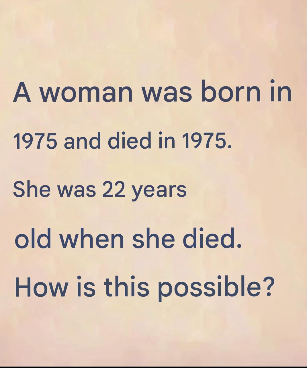 Początkowe założenie wydaje się nielogiczne: kobieta rodzi się i umiera w 1975 roku, ale ma 22 lata? Chyba że jest podróżniczką w czasie (a nawet wtedy!), wydaje się to niemożliwe. Więc naturalnie wymyślamy wyjaśnienia. Literówka? Inny kalendarz? Komplikujemy sprawy… gdy odpowiedź jest o wiele prostsza, niż nam się wydaje.