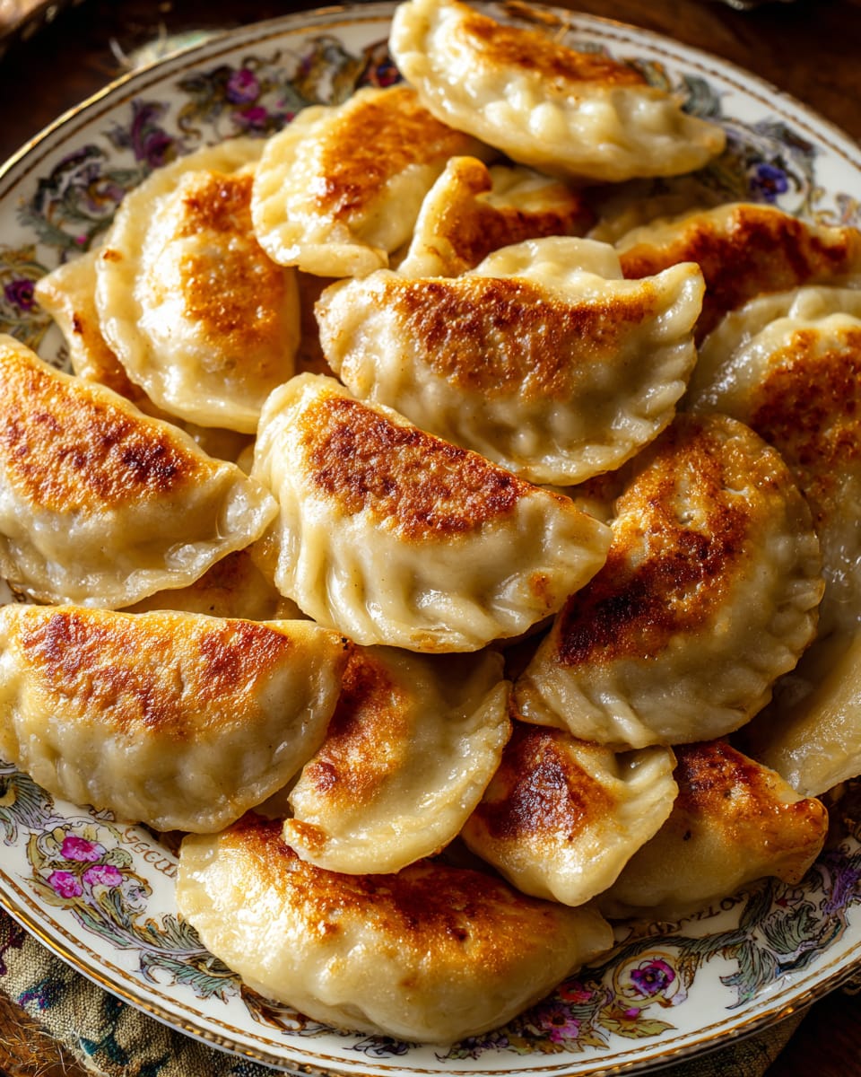 Rozgrzej masło i olej na patelni. Smaż pierogi na złoty kolor, dodaj wodę, przykryj i duś. Zdejmij pokrywkę, aby spód był chrupiący.