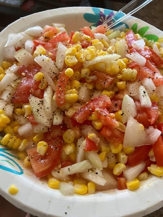 W misce wymieszaj kukurydzę, pokrojone pomidory i cebulę.